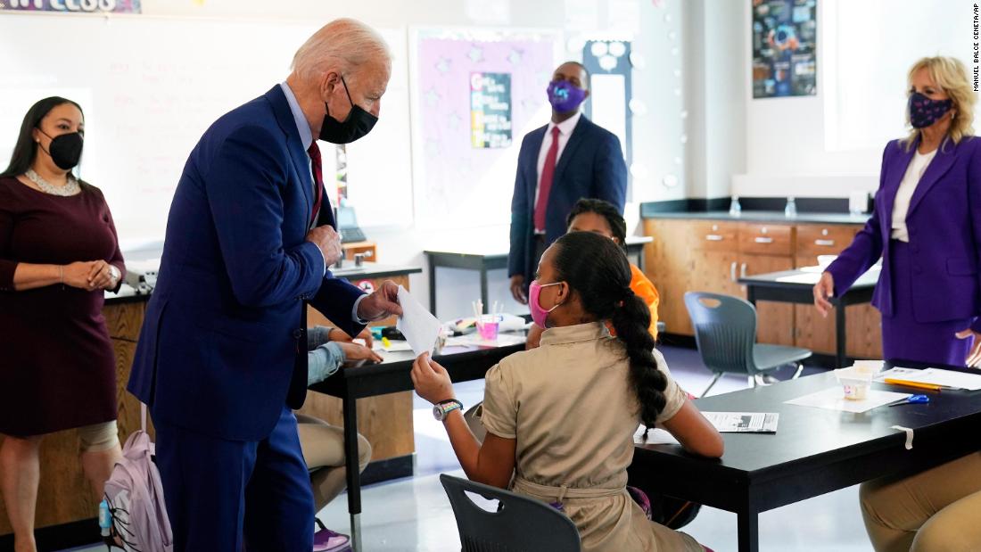 “If schools follow the science — and they are here — and implement safety measures like vaccinations, testing, masking, then children can be safe in schools, safe from Covid-19. My plan does all these things,” Biden said.