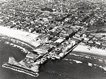 VENICE PIER: The photograph on the left was taken in 1925. It shows the 1,200-foot-long Kinney Pier, which was once the main attraction in this part of LA. According to the book, the pier’s namesake, Abbot Kinney, bought two miles of oceanfront real estate, dug canals and drained the marshes to build on the land, hoping to create a resort as impressive as Venice. LA annexed the beach after Kinney’s death in 1920 and the pier was closed. ‘Discovery of oil nearby added to the decay of the place as a resort,’ Rosemary explains. Today the area is hugely popular with tourists and bodybuilders visit to work out at the Muscle Beach weight pen, once frequented by Arnold Schwarzenegger. The area in fact has long been frequented by famous types. Rosemary reveals: ‘Venice is where Jim Morrison met Ray Manzarek to form the Doors and an endless series of movie scenes have been shot here’