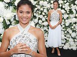 Radiant: Tennis sensation Emma Raducanu, 18, cut an elegant figure as she stepped out in a glimmering white ensemble for a London Fashion Week event tonight