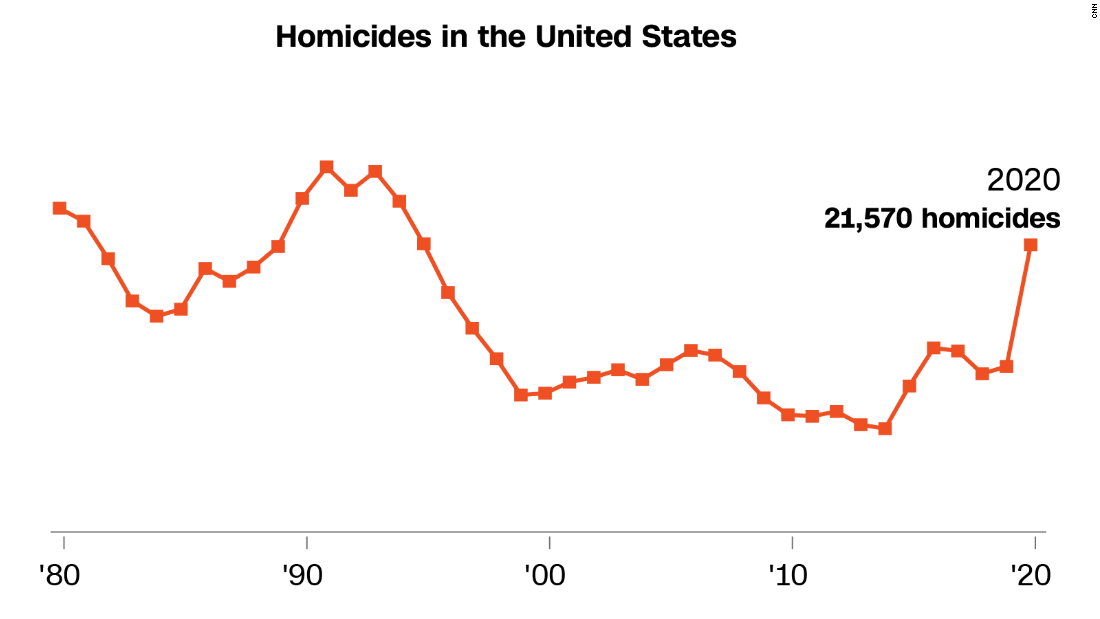 There were more than 21,500 murders last year, a total not seen since the mid 1990s. The murder rate in 2020 was about 6.5 per 100,000 people, about 40% below what it was in the 1980s and 1990s, when homicides peaked in the United States.