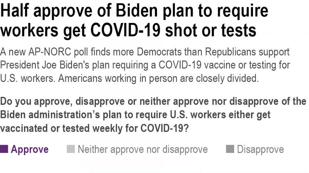 With the highly contagious delta variant driving deaths up to around 2,000 per day, the poll released Thursday by The Associated Press-NORC Center for Public Affairs Research showed that overall, 51% say they approve of the Biden requirement, 34% disapprove and 14% hold neither opinion.