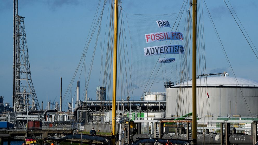 Activists used floating cubes emblazoned with fossil fuel-linked advertisements to block the entrance, along with the protest ship Beluga, with the words “Ban Fossil Fuel Advertising” strung between its two masts. Activists also climbed a 15-meter (yard) oil tank and attached advertisement posters next to Shell’s logo.