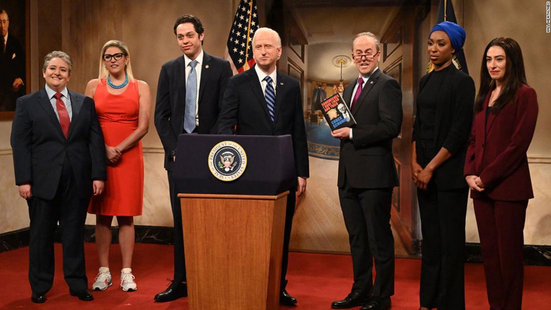 Saturday night’s skewering began with new cast member James Austin Johnson playing President Joe Biden recapping the highs and lows of his summer — Broadway shows are back again after the long Covid-related shutdown but “so is the Taliban,” Johnson quipped. “So, win some, lose some.”
