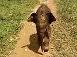 The elephant then trots towards its mother, thought to be waiting behind the camera, in delight.