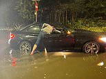 Surrey Police’s roads unit tweeted this picture overnight and said: ‘One driver had flooded their cars engine n the puddle on the A331 in lane 2. The van driver has then aquaplaned in the very same puddle & collided with the car. Sorry to keep repeating our self but drive to the conditions, slow down & increase your stopping distance. #heavyrain’