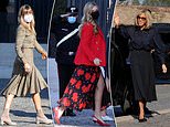 Elsewhere French first lady Brigitte Macron proved her effortless Parisian style, donning a navy and black silk shirt, a pleated maxi skirt and power heels as she waved to onlookers.