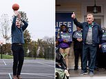 Heating up: The GOP candidate removed his jacket to continue shooting hoops as drizzles cleared and the day warmed up