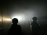 Pictured: Bright lights are shown streaming through a barbed wire fence last night on the Poland-Belarus border, as Belarusian troops stopped Polish troops from fixing the fence