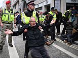 The eco-warriors are forcibly pulled from the roads by City of London police officers. A woman can be pictured shouting (bottom right) as she is dragged away by officers