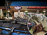 The front of a store is totally unrecognizable after storm winds rip off the sign and badly damage the ceiling of a business