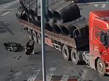 Moment biker cheats death when he runs a red light and is hit by a lorry which almost crushes him as it tips over and sheds its load in China