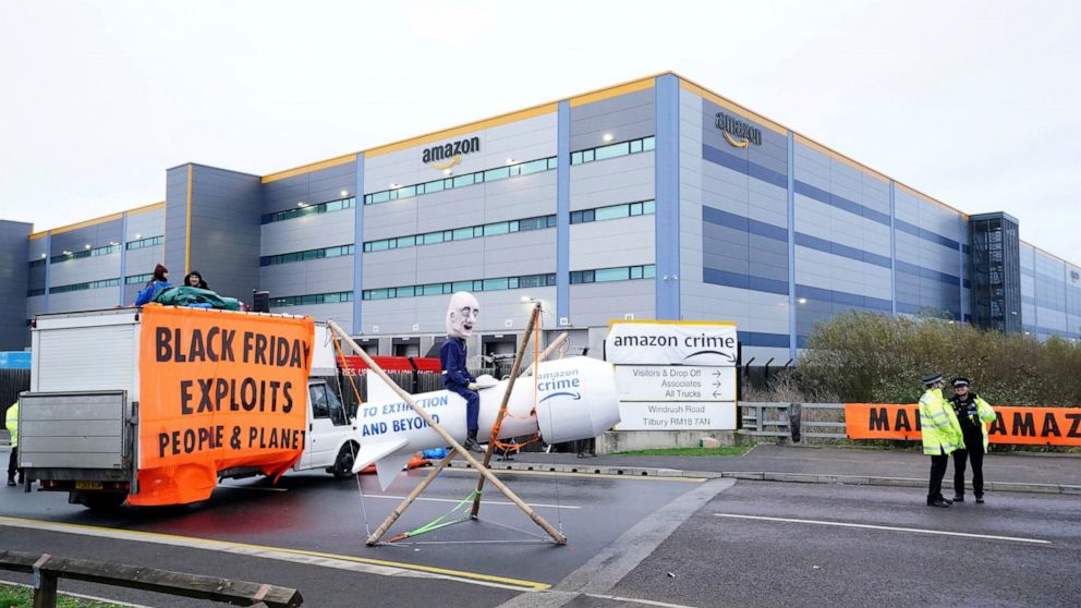 In the U.K., activists blocked the entrance to Amazon’s warehouse in Tilbury, just east of London, with an effigy of Amazon founder Jeff Bezos sitting on top of a rocket.