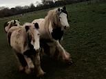 Dogwalker Pete evaded a herd of hungry horses he had just fed in Clwyd, WalesThe man can be heard nervously laughing as he walks and calls for his two dogs Pete and the dogs, Sherlock and Tiny, ran from the horses, who wanted carrots