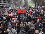 A banner, right, reads ‘Unvaccinated Lives Matter’ as thousands of demonstrators marched in Utrecht, Netherlands, yesterday