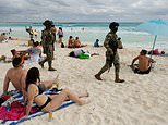 Tourists were sent scrambling for cover after gunmen arrived on jet skis at a beach in Mexico’s Caribbean cost resort of Cancun and opened fire. Pictured: Members of the National Guard patrol a beach report in Cancun on Sunday