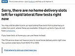 The website currently states it is not possible to order lateral flow testing kits for home delivery with a message stating: ‘Sorry, there are no home delivery slots left for rapid lateral flow tests right now.
