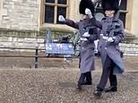 Footage captured from the Tower of London earlier today shows a group of tourists take photographs of the two Guardsmen in their ceremonial bearskin hats as they march across the grounds.