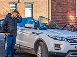 A shocked motorist looks on at the remains of his £40,000 Range Rover in South Shields, Tyneside after debris collapsed on top of the vehicle following strong winds brought by Storm Malik