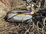 The Met Office has issued a ‘danger to life’ warning as gusts of up to 80mph could batter northern areas of the UK this weekend as Storm Malik sweeps in. Pictured: A fallen tree on top of a car in West Ralnton, near Durham yesterday morning