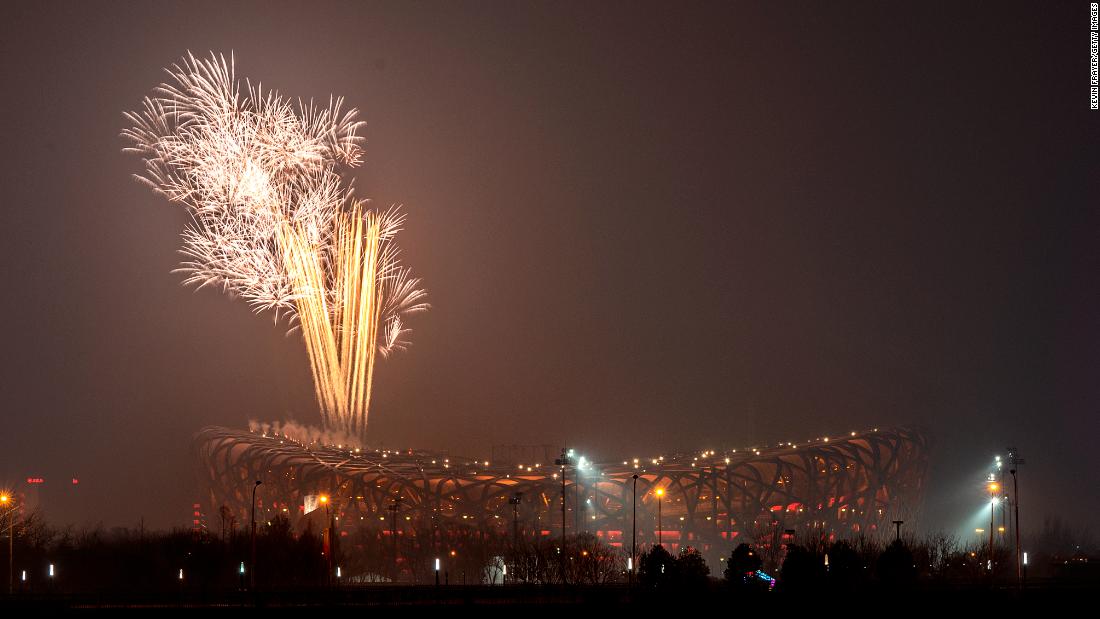 Top image: Fireworks seen over the National Stadium, also known as the Bird’s Nest, during a rehearsal for the Beijing 2022 Winter Olympics opening ceremony on January 30, 2022.
