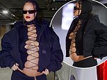 Pregnant Rihanna shows off her blossoming bump in a laced-up top