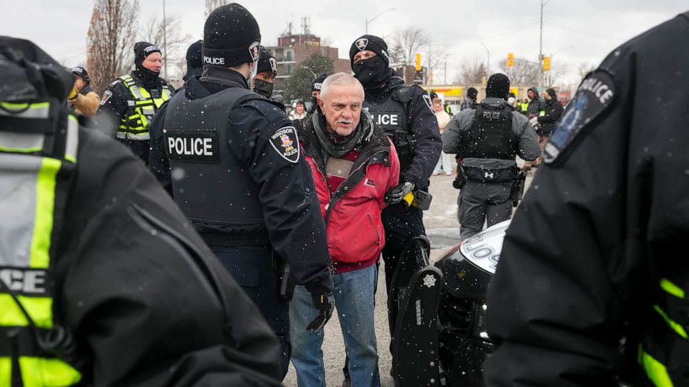 WINDSOR, Ontario — Police moved in to clear and arrest the remaining protesters near the busiest U.S.-Canadian border crossing on Sunday, ending a demonstration against COVID-19 restrictions that has hurt the economy of both nations even as they held back from a crackdown on a larger protest in the capital, Ottawa.