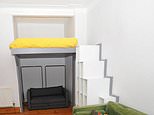 A one-bed flat that is so small its sleeping area appears to be by walking up a staircase-shaped shelf.