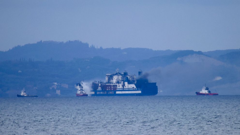The ferry has been towed to the port of Kassiopi, in northeastern Corfu, by three tugboats, authorities said. Firefighters were still battling the blaze, which, although confined in certain spaces, reignites from time to time, and thick smoke is hanging over the ship.