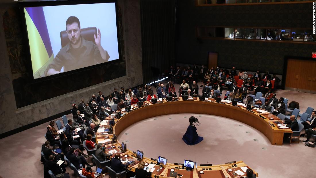 Ukraine’s President delivers a graphic description of Russian atrocities in a hard-hitting speech to the UN Security Council