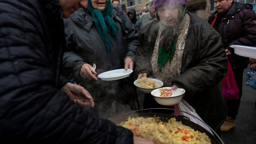 BUCHA, Ukraine — Civilians remaining in Bucha lined up Saturday for food donated by the local church in the battered Kyiv suburb where Ukrainian forces and journalists reported evidence of war crimes after Russian soldiers withdrew.