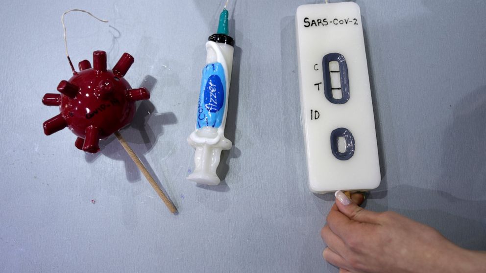 High-selling designs this Easter include pandemic-themed candles that resemble COVID-19 test kits, vaccination syringes and even red-colored representations of the ball-and-spike shaped virus itself.