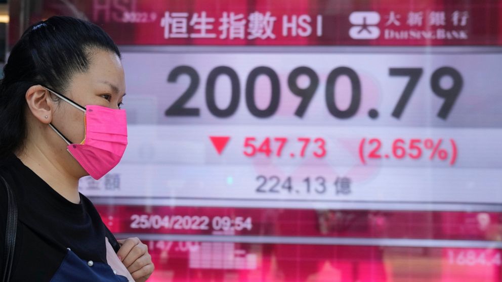 U.S. stocks are following global markets lower, especially in China, over worries that strict lockdown measures there might crimp the world’s second-largest economy and potentially hurt global economic growth. Hong Kong’s Hang Seng slumped 3.7%. The Shanghai Composite fell 5.1%.