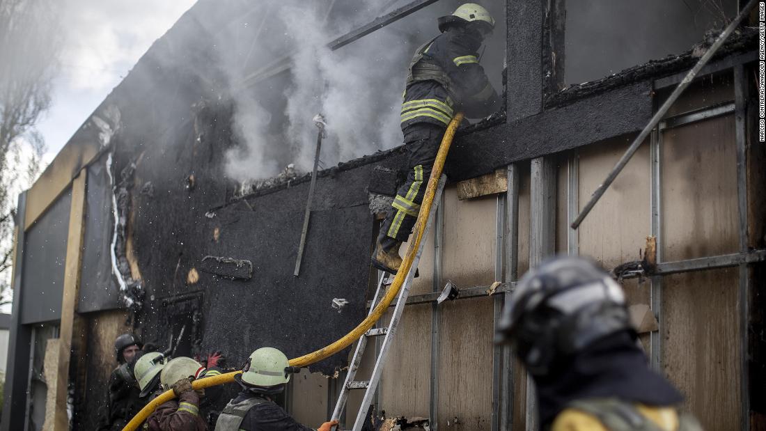 Firefighters work to extinguish a fire in a commercial area following a rocket attack in the Saltivka area of Kharkiv, Ukraine, on April 26. (Narciso Contreras/Anadolu Agency/Getty Images)