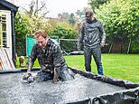 Storming round to Phill’s (left) when the truth comes out, Tyrone (right) struggles with him, and the pair fall into the wet cement on the patio