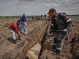 Pictured: Cemetery workers bury a coffin at a cemetery in the village of Staryi Krym, outskirts of Mariupol. With a population of 450,000 before the war, it is thought 20,000 have been killed and barely 100,000 remain in a city nearly entirely destroyed, without access to food, water or electricity since early March