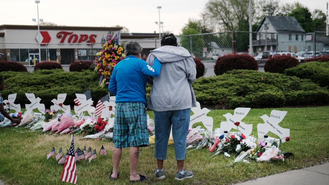 BUFFALO, NEW YORK – MAY 20: People gather at a memorial for the shooting victims outside of Tops market on May 20, 2022 in Buffalo, New York. 18-year-old Payton Gendron is accused of the mass shooting that killed 10 people at the Tops grocery store on the east side of Buffalo on May 14th and is being investigated as a hate crime.