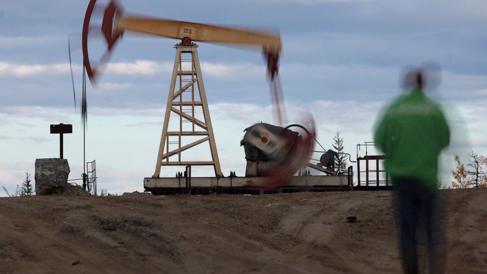 FILE – Sept. 10, 2011 file photo photo showing an oil rig near the town of Usinsk, 1500 kilometers (930 miles) northeast of Moscow. The European Union’s executive commission has proposed phasing out imports of Russian oil within six months. It is part of Europe’s struggle to stop paying Russia $850 million a day for energy and hit the Kremlin’s finances over its invasion of Ukraine. (AP Photo/Dmitry Lovetsky)