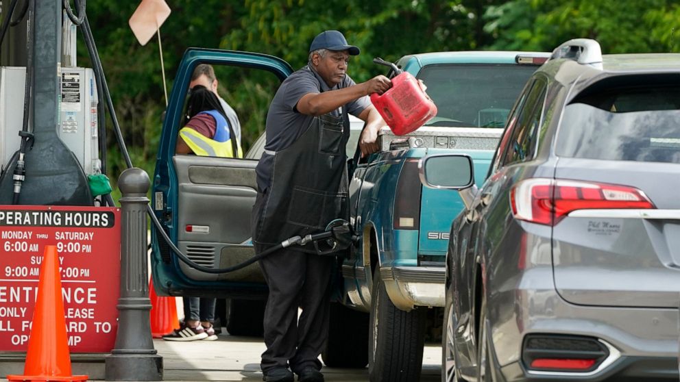 A customer pumps gas at this Madison, Miss., Sam’s Club, after filling up a gasoline container, Tuesday, May 24, 2022. Wholesale retail chains stores like Costco and Sam’s Club tend to price their gas and diesel competitively against one another while major gas chain prices are usually higher. (AP Photo/Rogelio V. Solis)