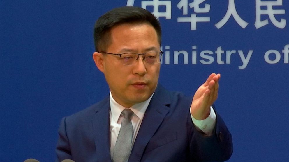 FILE – In this image made from video, Chinese Foreign Ministry spokesperson Zhao Lijian gestures during a media briefing at the Ministry of Foreign Affairs office, on Wednesday, April 6, 2022, in Beijing. China’s government on Thursday, June 2, 2022, accused Washington of jeopardizing peace after U.S. envoys began trade talks with Taiwan aimed at deepening relations with the self-ruled island democracy claimed by Beijing as part of its territory. (AP Photo/Liu Zheng, File)