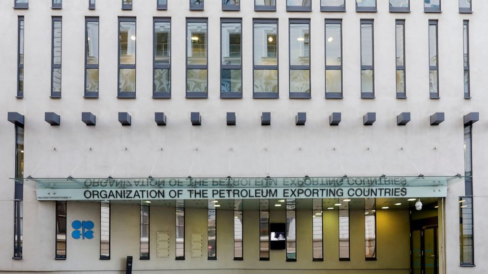 FILE – The logo of the Organization of the Petroleum Exporting Countries (OPEC) is seen outside of OPEC’s headquarters in Vienna, Austria, on March 3, 2022. The OPEC oil cartel and allied countries including major exporter Russia are weighing how much oil to send to the world economy as U.S. gas prices hit another record high.  Thursday’s meeting comes amid speculation that the 23-member alliance, known as OPEC+, may considered breaking from its cautious series of increases and agree to pump more oil amid fears that high energy prices could slow the global economy. (AP Photo/Lisa Leutner, File)