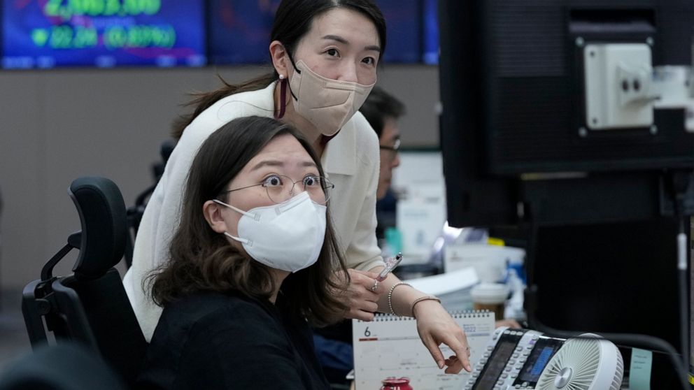 Currency traders watch monitors at the foreign exchange dealing room of the KEB Hana Bank headquarters in Seoul, South Korea, Thursday, June 2, 2022. Asian shares declined Thursday, echoing a retreat on Wall Street as investors fretted about higher interest rates and rising coronavirus cases in parts of the region. (AP Photo/Ahn Young-joon)